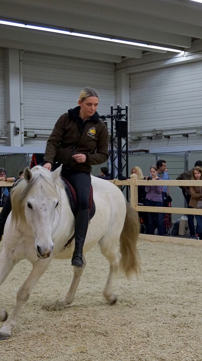 Dass die Arbeit mit Parelli am Boden später auch beim Reiten hilft, zeigt Klaudia am Ende der Stunde. Sie klettert auf ihren Schimmel, der ganz brav stehen bleibt, und nur mit Fellsattel und gebissloser Zäumung ausgestattet ist. Die Zuschauer erleben die sprichwörtliche Einheit von Pferd und Reiter, als sie auf einem ausbalancierten, abschnaubenden Pferd selbst höhere Lektionen wie Traversalen, Passage, fliegende Galoppwechsel zeigt. Und das Pferd versteht - ohne Gerte und Sporen. Spätestens jetzt hat auch der letzte Zweifler gemerkt, dass dieses Parelli doch eine ganz nützliche Sache sein kann - gerade für Dressurreiten, wo es ja auf möglichst unsichtbare Hilfen ankommt.
