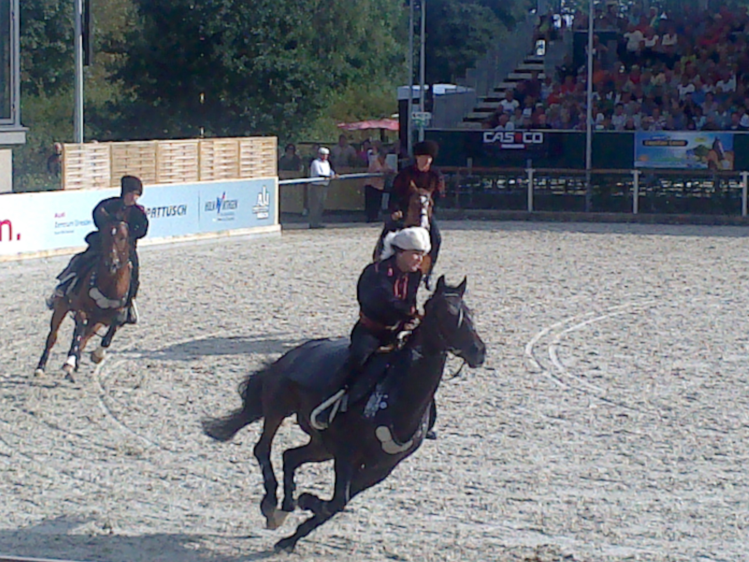 Zum Ende hin wird es nochmal actionreich: Zu den altbekannten Klassikern in Moritzburg gehören die "Kosakenreiterei", bei der die Reiter im vollen Galopp halsbrecherische Darbietungen zeigen, sowie das "Pushballspiel", eine Art Pferdefußball.